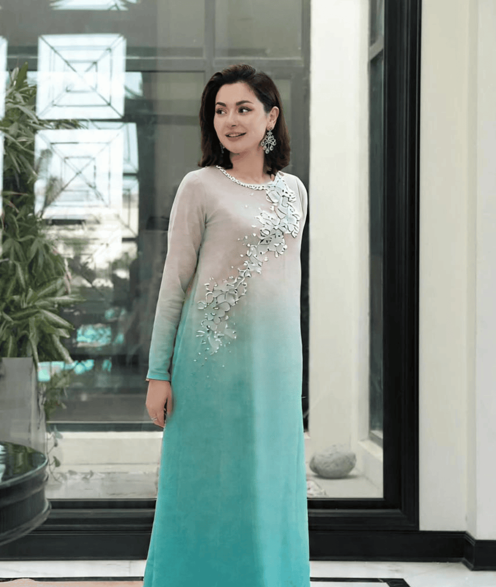 Grace meets modern elegance in this stunning ombre long dress, blending soft beige into refreshing aqua blue. The dress features intricate hand embellishments along the shoulder and bodice, adding just the right touch of sparkle without overpowering the look.