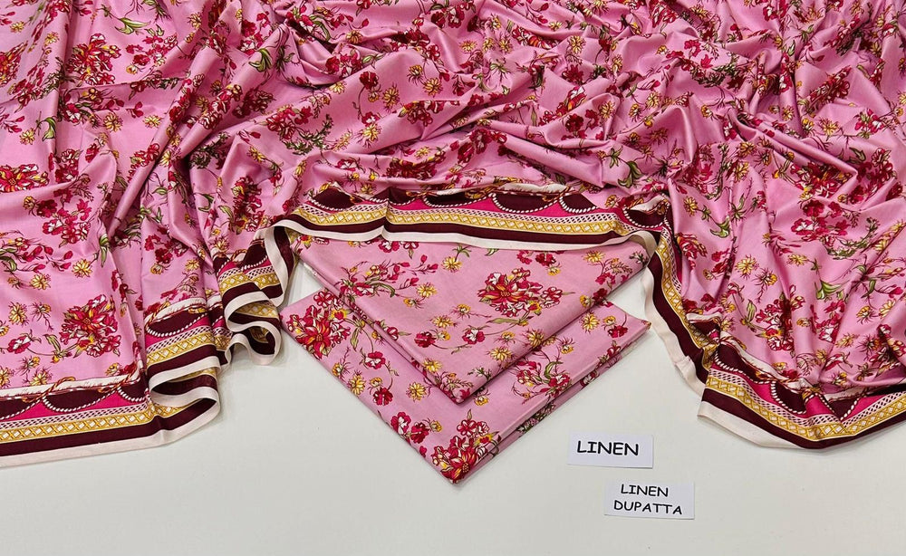 Linen 3 piece unstitched collection. Linen shirt and trouser with printed linen dupatta.