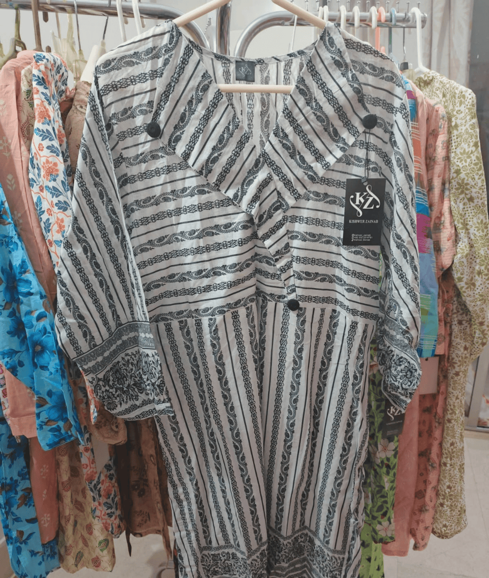Step into timeless style with this chic black and white printed lawn kurti from Kishwer Zainab. Designed for comfort and sophistication, it features: