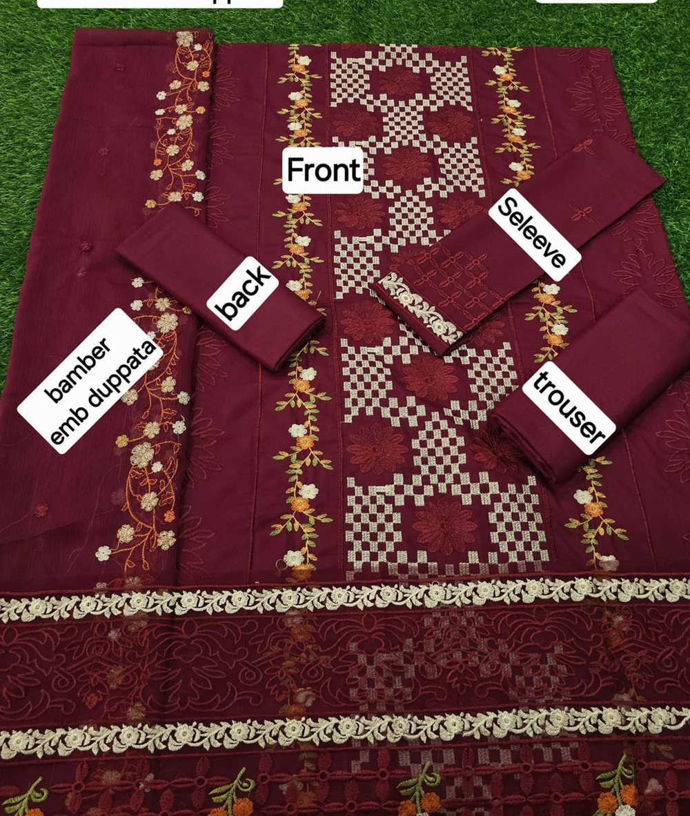 Wrap yourself in elegance with this Maroon 3-Piece Embroidered Linen Suit, designed to keep you warm and stylish throughout the winter season. The rich maroon base is adorned with intricate gold thread embroidery, enhancing its festive charm. Paired with a coordinated embroidered dupatta and trousers, this outfit is perfect for family gatherings, seasonal events, and semi-formal occasions.