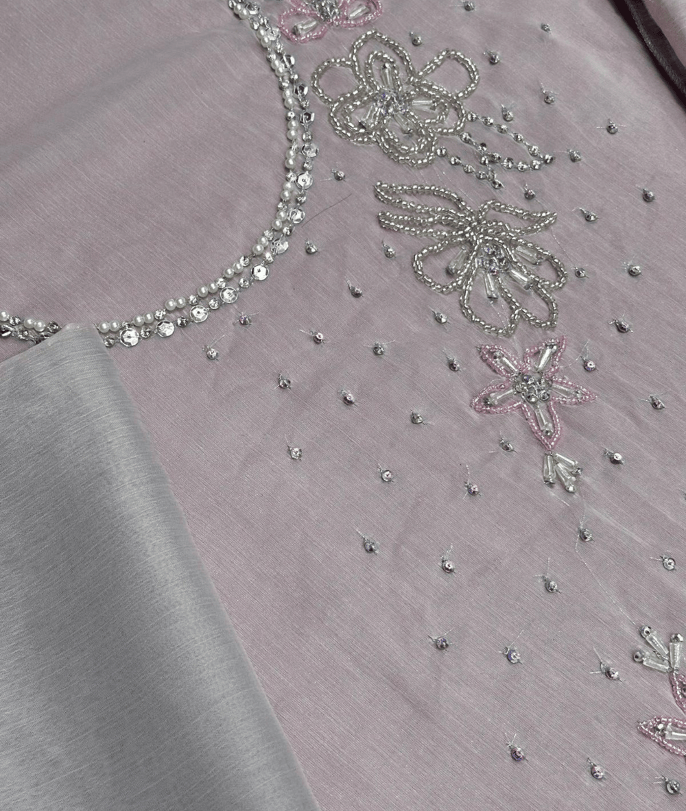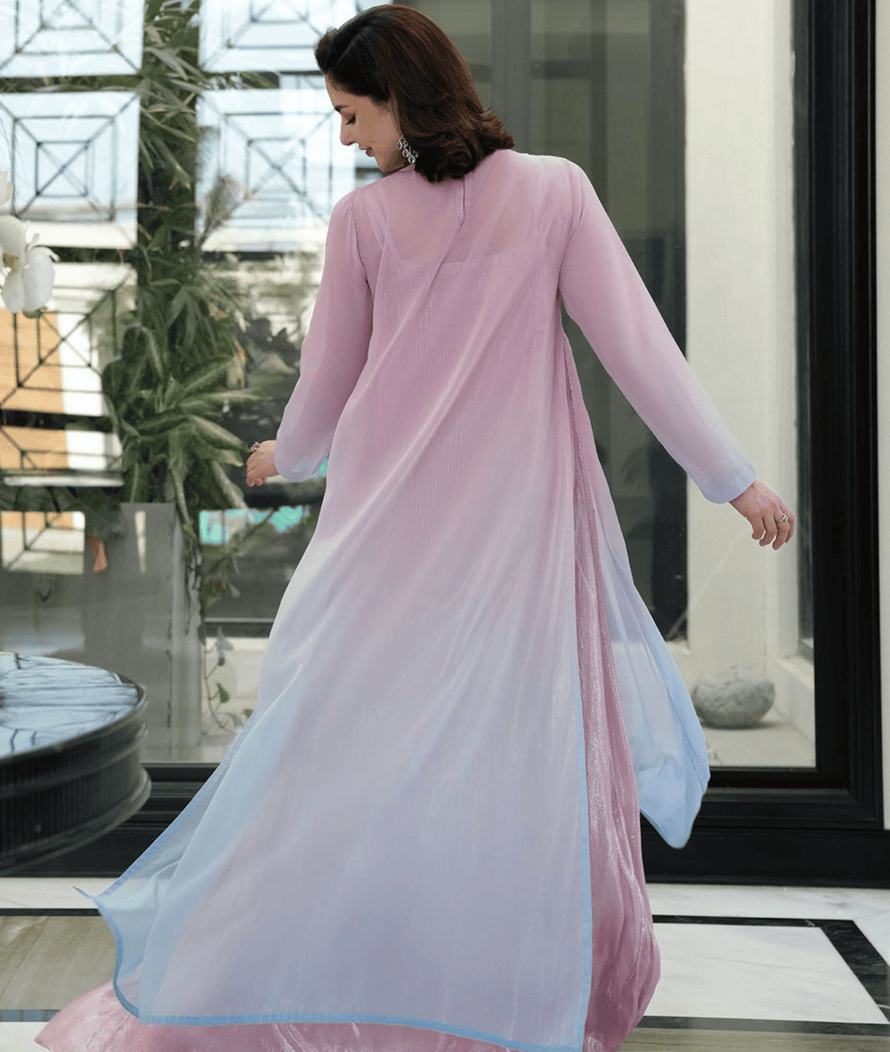 Step into elegance with this Pastel Ombre Fancy Maxi Dress, beautifully shifting from soft lavender to icy blue tones. Adorned with delicate hand embellishments on the neckline and bodice, this graceful outfit is the perfect pick for wedding events, evening gatherings, or formal celebrations.